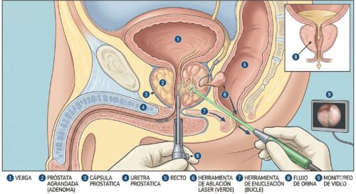 Lo que hace el láser es bastante preciso: vaporiza el tejido prostático sobrante. Es decir, lo elimina capa por capa hasta que el canal por donde pasa la orina vuelve a quedar abierto.